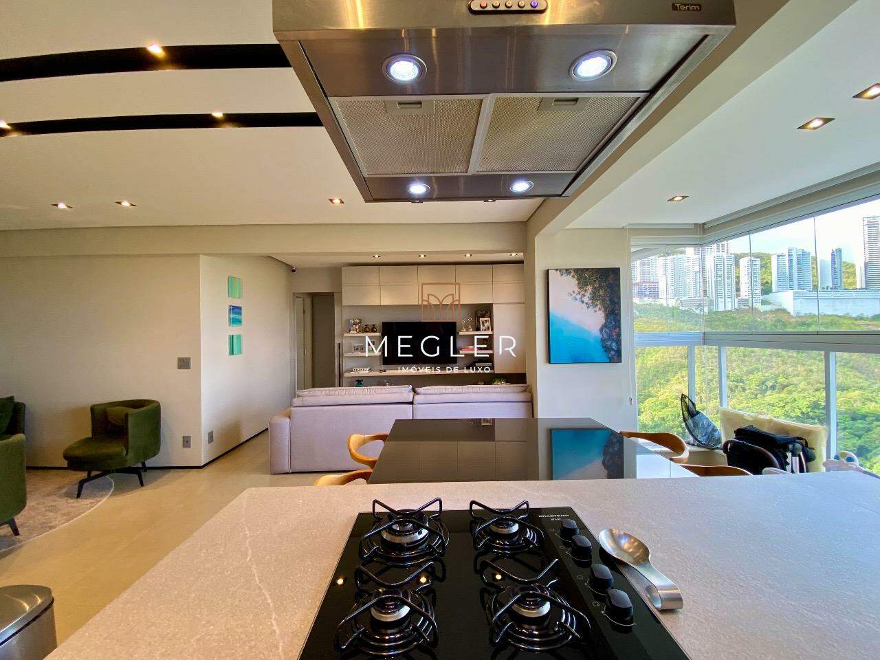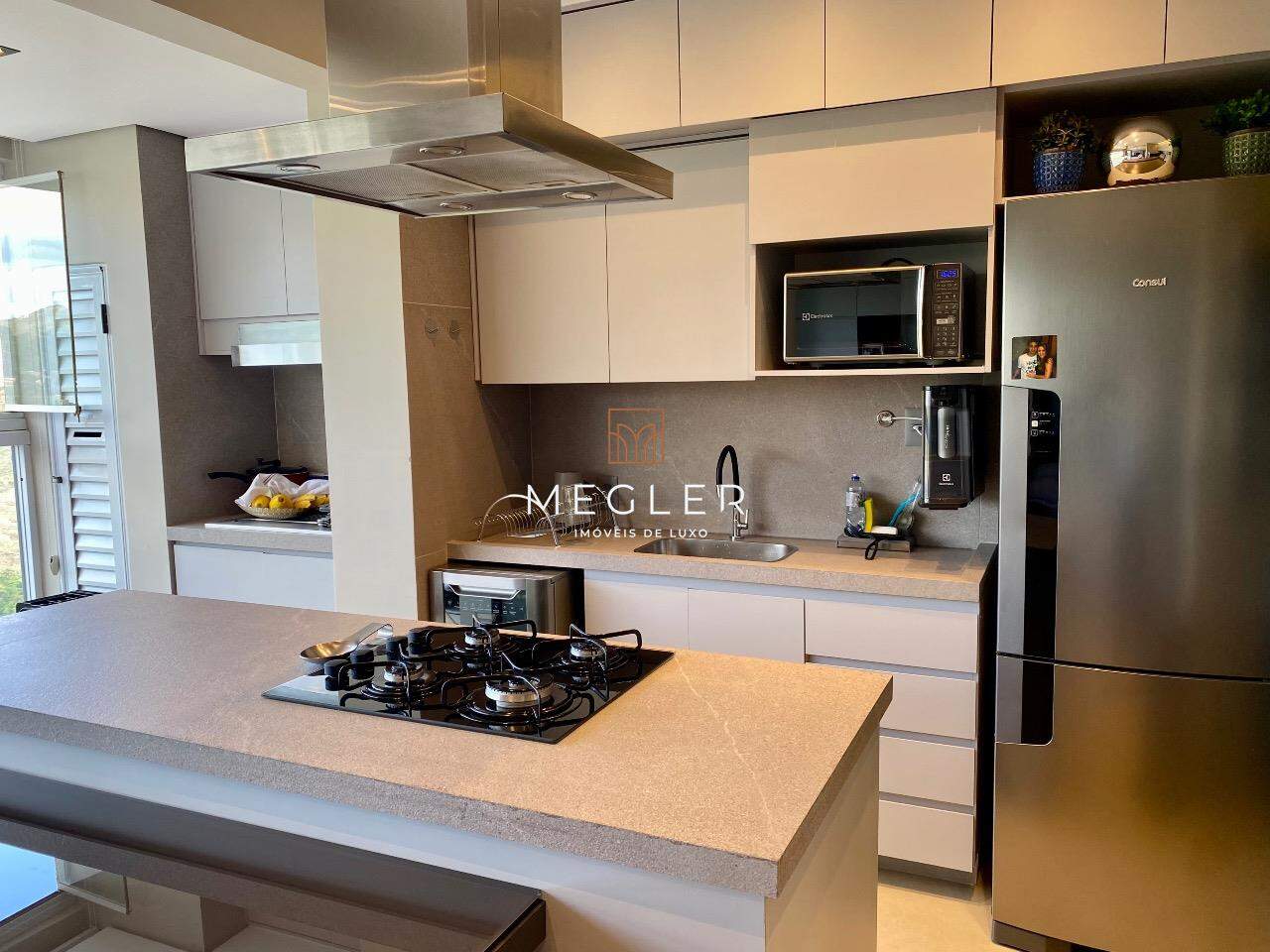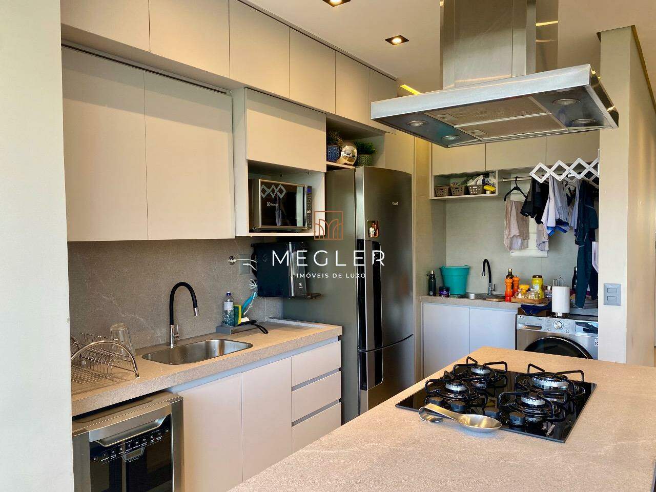 A cozinha americana, planejada com armários sob medida e bancada em granito, integra funcionalidade e estilo. No corredor, a rouparia traz praticidade ao cotidiano.