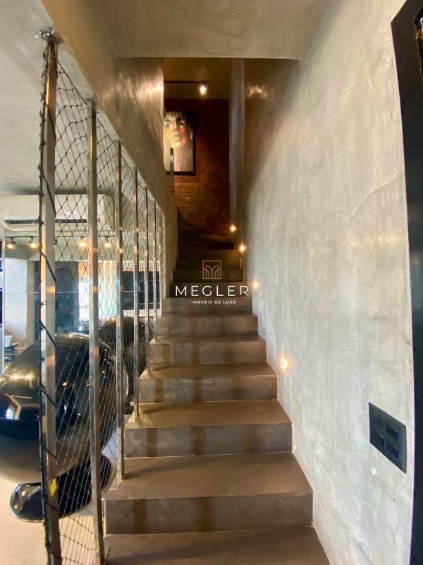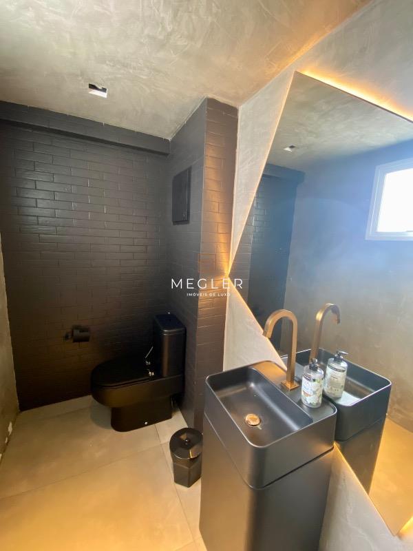 No primeiro pavimento, o imóvel conta com sala para dois ambientes, lavabo, cozinha americana integrada à varanda com pé-direito duplo e vista, além de área de serviço.