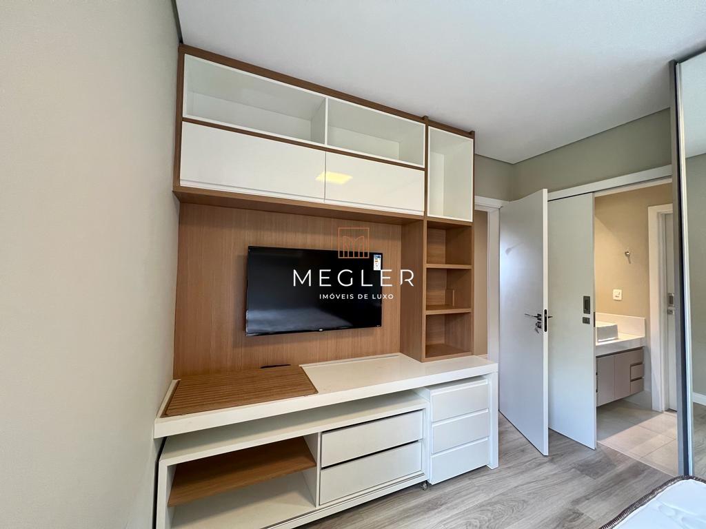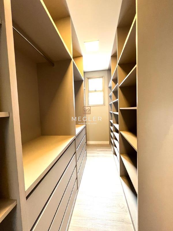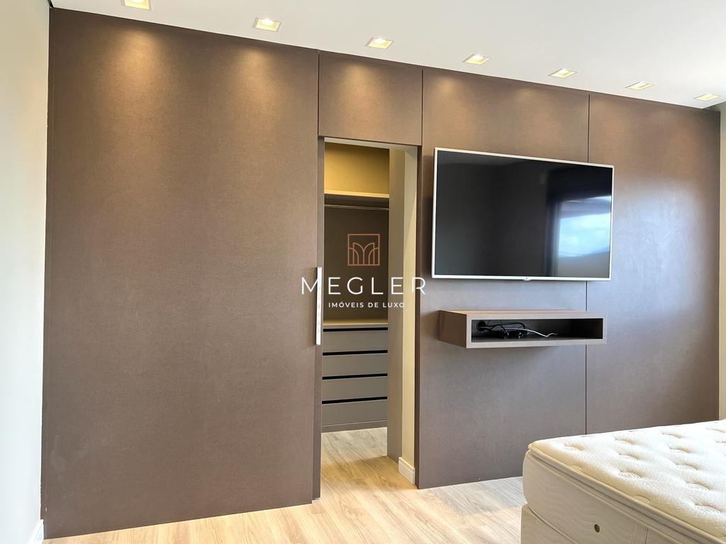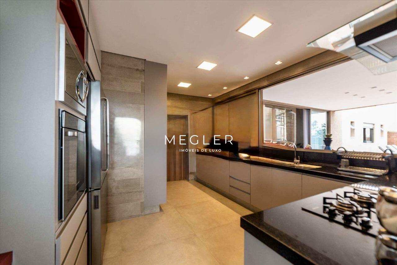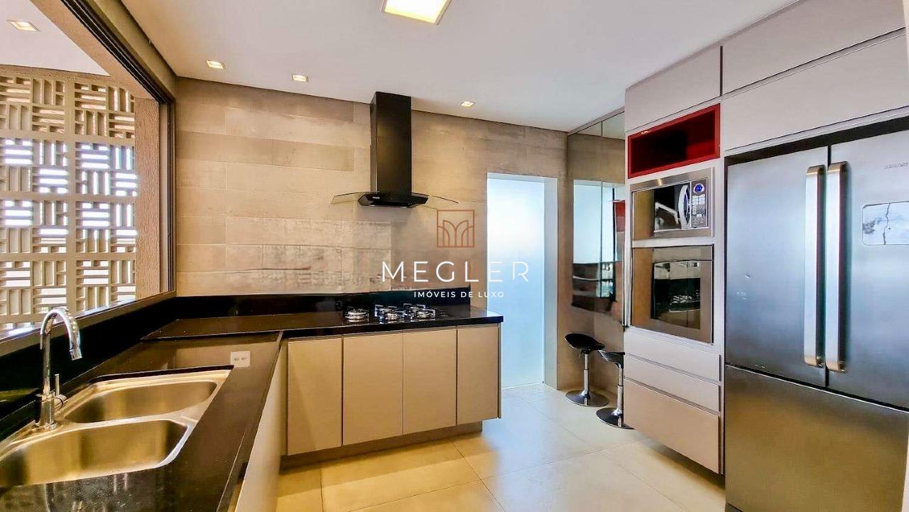 Acabamento em porcelanato e madeira, com lareira em travertino romano. O imóvel é mobiliado, tem escritório, closet, rouparia, despensa e armários planejados em todos os ambientes. e conta com DCE, área privativa e área de serviço.